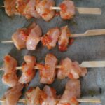 - Doe de kipfilet of metalen of bamboe stokjes. Leg een vel bakpapier op de ovenplaat en leg de spiesjes op de ovenplaat.