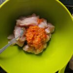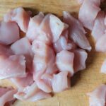 - Snij de kipfilet in stukken van 3-4 cm en doe in een kom.