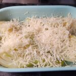 - Strooi er dan de geraspte Parmezaanse kaas overheen. en giet de double cream erover heen. Bak in de voorverwarmde oven totdat het mooi goudbruin is (ongeveer 15-20 minuten).