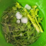 • Leg de sla, stukje bleekselderij met blaadjes en de platte peterselie in een kom koud water met ijsblokjes.