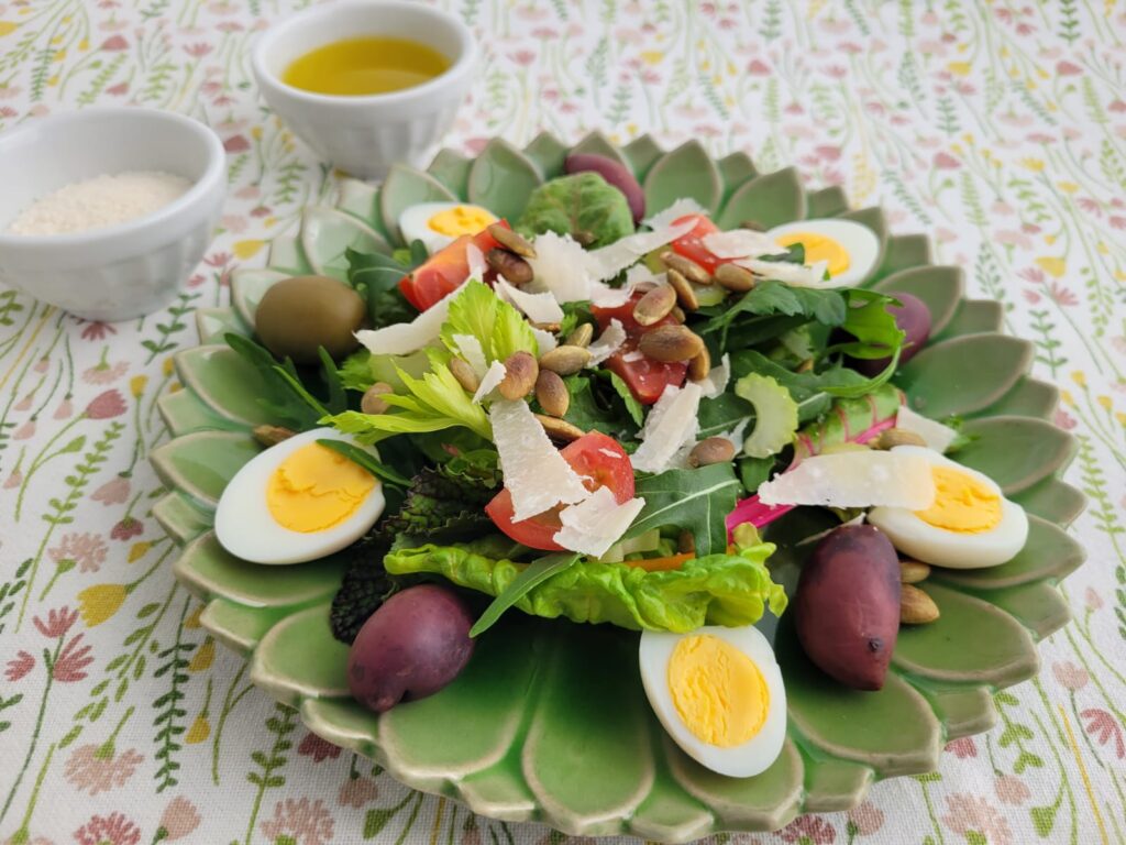 Deze lekkere salade gebruikt typisch Italiaanse ingrediënten. De sla bestaat uit rucola, jonge snijbiet, bloedzuring, platte peterselie, bleekselderij, selderij blaadjes, tomaatjes, Parmigiano Reggiano, olijven, geroosterde pompoenpitten met een dressing van een heel goede Italiaanse extra vierge olijfolie en vers geperst citroensap. En natuurlijk kwarteleitjes, waar ik wat knoflookzout op gedaan heb.